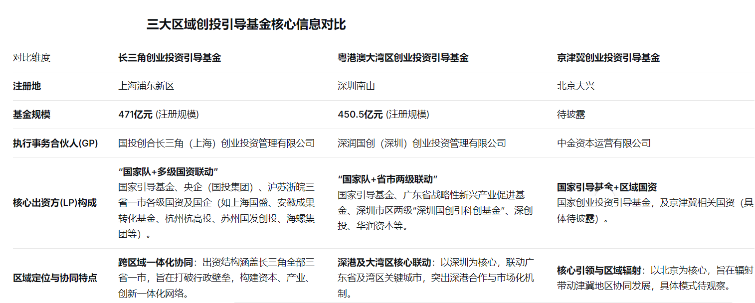 从三只区域子基金横向对比来看,在总体目标和核心机制(如20年存续期、专注“投早投小投硬科技”)上保持一致,但长三角基金在出资结构、区域定位和协同路径上,有着鲜明的差异化特点与协同价值。