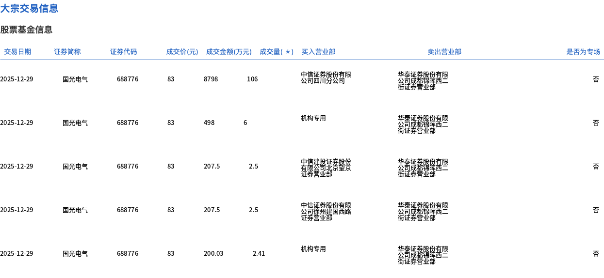 12月29日,国光电气大宗交易成交119.41万股,成交额9911.03万元,占当日总成交额的10.86%,成交价83元,较市场收盘价101.7元折价18.39%。