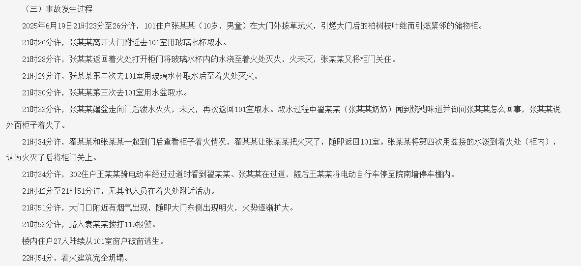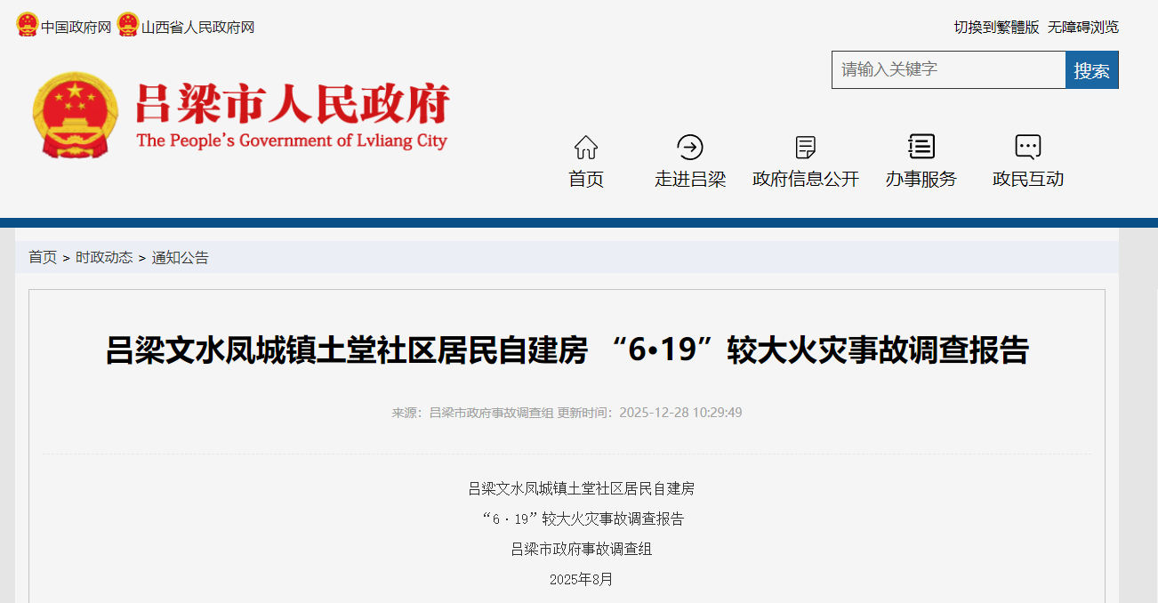 12月28日,山西省吕梁市人民政府官网发布了文水凤城镇土堂社区居民自建房“6·19”较大火灾事故调查报告。调查认定,该事故是一起居民自建房违法建设、施工,用于出租,因儿童玩火引发的较大火灾事故。