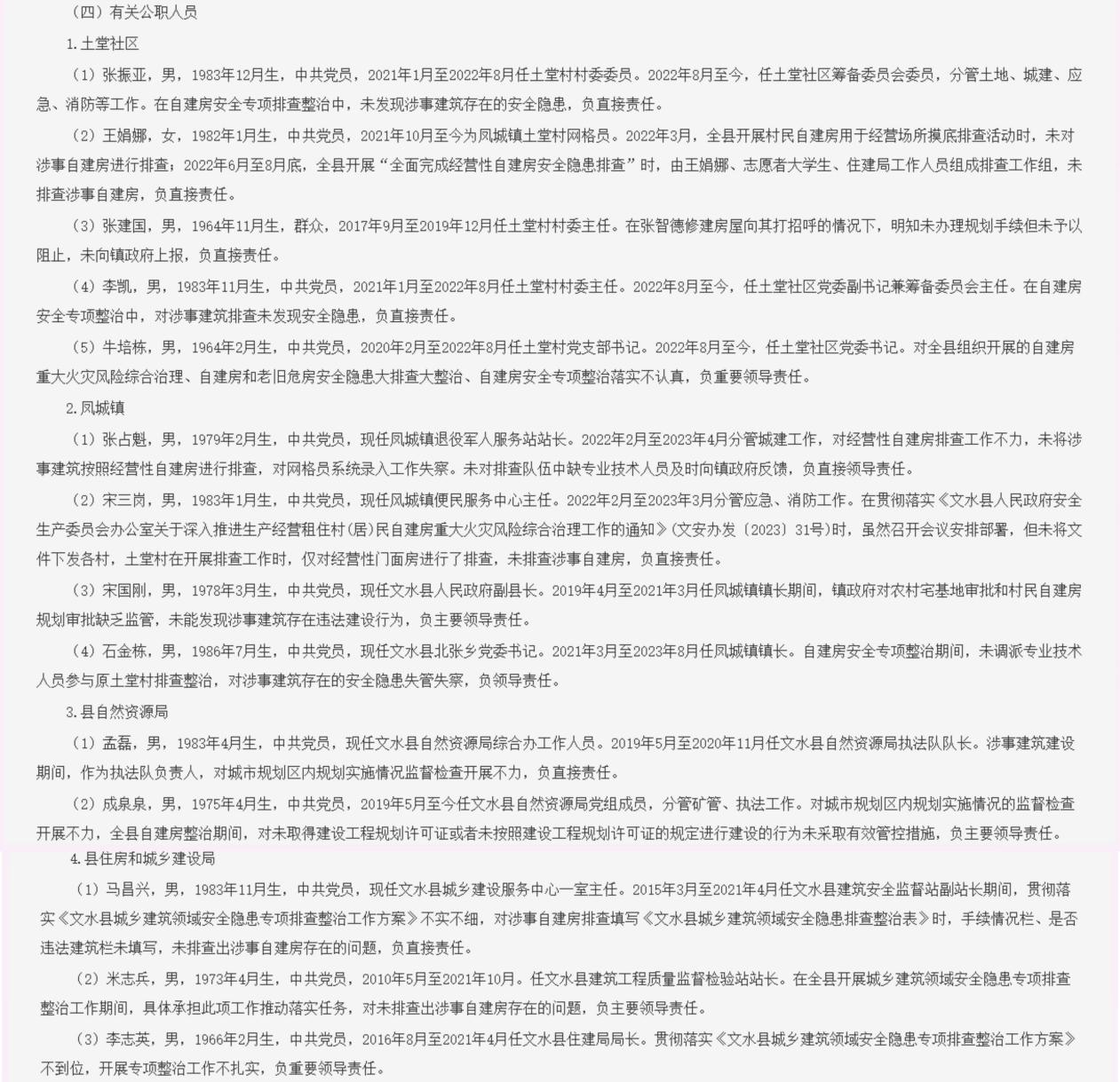 因未发现涉事建筑存在的安全隐患、未排查涉事自建房等原因,土堂社区筹备委员会委员张振亚、凤城镇土堂村网格员王娟娜(女)、2017年9月至2019年12月担任土堂村村委主任的张建国、土堂社区党委副书记兼筹备委员会主任李凯、现任风城镇便民服务中心主任宋三岗、现任文水县自然资源局综合办工作人员孟磊、现任文水县城乡建设服务中心一室主任马昌兴负直接责任。