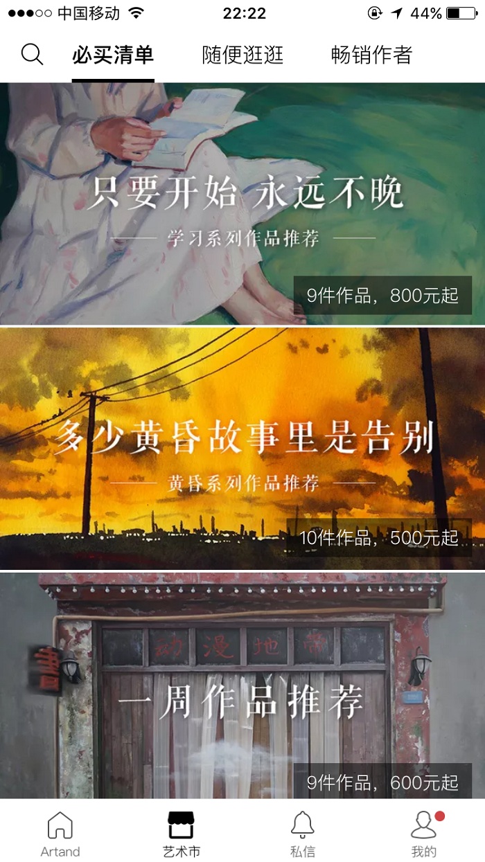 于是胡来尝试将平台上的资源变现,举行了“行走的美术馆”线下展览活动。他们与本地高端酒店、商场合作,为平台上的年轻画家策划市场活动,目的是帮他们卖出去作品。“客单价和复购率都比较高”,线下展览的转化率还不错。但毕竟这种销售模式过重,阿里出身的李小平决定开始做线上平台,尝试用互联网的方式解决问题。