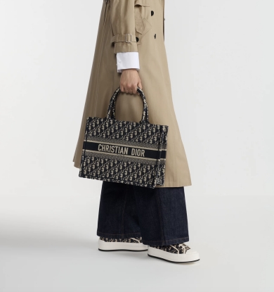 (图注:左:Book Tote手袋整体展示,廓形挺括,经典现代。中:细节展示,经典Oblique印花,饰品牌标识,尽显时尚格调。右:模特卡其风衣下搭蓝裤印花鞋,手提DIOR托特包,彰显摩登优雅。)