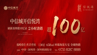 备受瞩目的中信城开信悦湾项目正式开盘,据开发商透露,开盘仅两小时项目销售金额便突破100亿元,其中顶复席位开盘1小时即售罄,刷新深圳过亿套数纪录,以震撼市场的“信悦湾速度”,再次刷新市场认知。