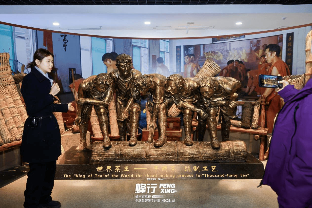 随后,掌柜们走进总面积3500平方米的湖南省茶叶博物馆,开启一场茶文化的沉浸之旅。在茶文化科普区,大家系统了解茯砖茶发展史及黑茶、青茶等不同茶类的品质特性与工艺流程;在镇馆之宝——国家级非遗“千两茶” 的展示前,实景场景与互动设备生动复原了其独特的踩制工艺,掌柜们感受着一片茶叶从山间到杯中的文明旅程。这趟文化洗礼,让掌柜们理解KGOS产品不仅是科技结晶,更是千年茶养智慧的时代焕新。