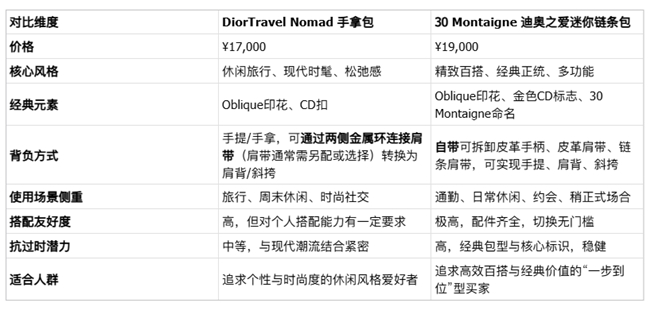 当我们把目光投向迪奥,这个承载着巴黎高级时装屋基因的品牌,答案或许就藏在“经典永续”四个字中。首次入手Dior,在1.7万的DiorTravel Nomad手拿包与1.9万的30 Montaigne迪奥之爱链条包之间纠结的核心诉求,无非三个:够经典、能百搭、不易过时。