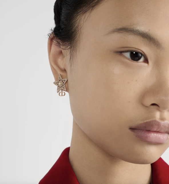 • 不对称设计:一侧是密镶银色调晶体和白色树脂珠饰的闪亮星星,垂悬珠饰灵动优雅;另一侧是经典的CD标志。这种平衡恰如Sophie的职业与个性——理性与浪漫并存。