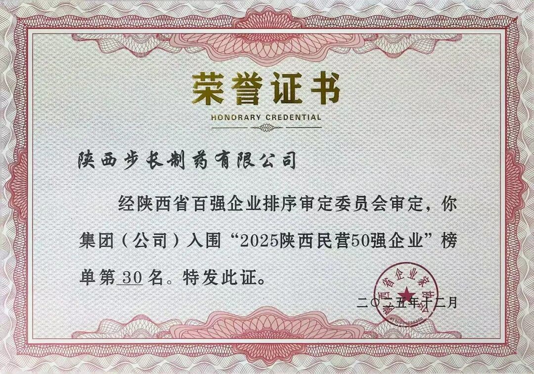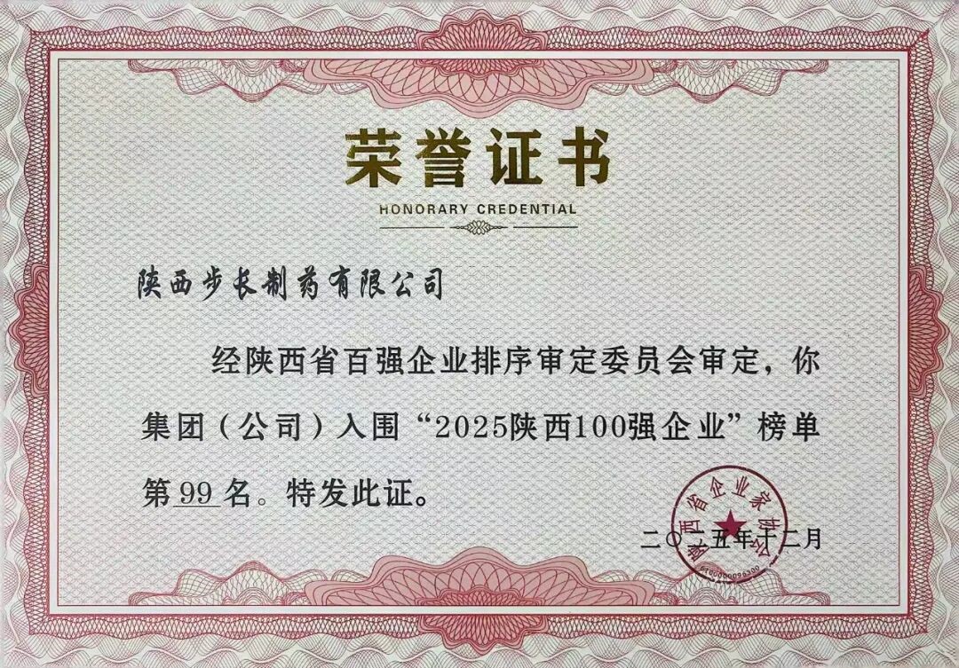 从2012年开始,在陕西省发改委、工信厅、财政厅、人社厅、商务厅、国资委、统计局、地方金融监管局、省总工会等部门支持下,由陕西省企业家协会牵头,每年开展一次陕西企业百强排序发布工作。自2019年开始,每年开展一次陕西民营企业50强排序工作。陕西步长制药不懈努力一直位于50强榜单,多次入选百强榜单。