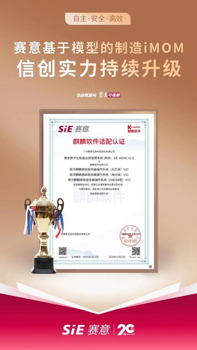 目前,赛意iMOM已通过麒麟操作系统兼容适配认证,可充分满足制造企业国产替代对高性能、高安全性、高可靠性的严苛需求,助力制造企业构建“自主、安全、高效”的数字化底座。