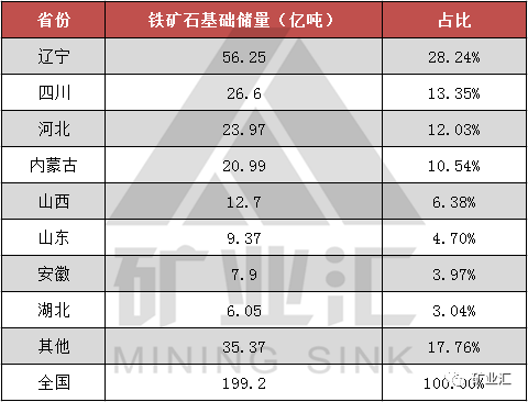 辽宁、四川、河北三省,占全国的总储量的53.62%。从区域看,环渤海地区是我国铁矿石资源的主要分布地区,西南地区储量也较多,其他地区储量较低。我国铁矿石基础储量在主要省份的分布如下: