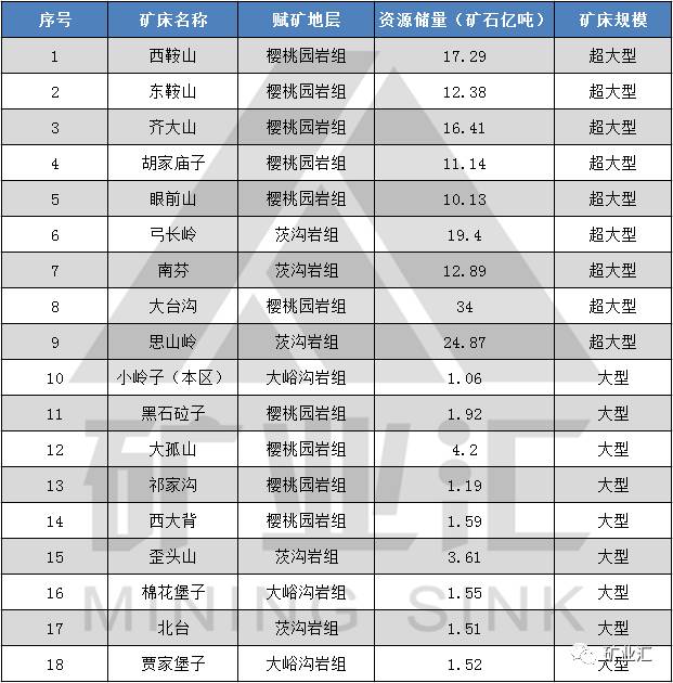 鞍本地区已发现 9 个资源量超过 10 亿吨的超大型铁矿床。其中,有 6 个分布在樱桃园岩组地层中,3 个分布在茨沟岩组中。这 9 个超大型铁矿已探明的铁矿石资源储量总计158.51亿吨。