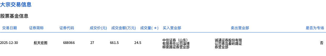 12月30日,航天宏图大宗交易成交24.5万股,成交额661.5万元,占当日总成交额的0.65%,成交价27元,较市场收盘价31.21元折价13.49%。