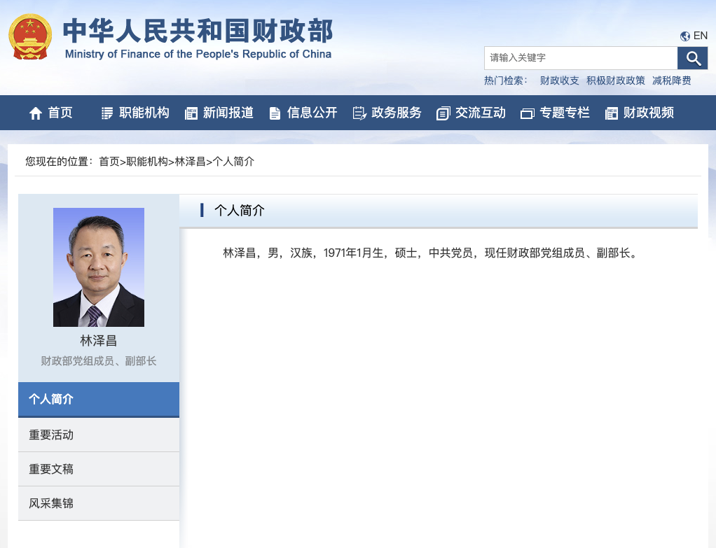 据财政部官网消息,林泽昌已任财政部党组成员、副部长。