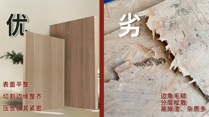 理解了欧松板是什么板材,便了解了它的优势,但并非所有名为“欧松板”的产品都名副其实。一些不良厂商为降低成本,可能使用来源不明的杂木、废旧回收料作为原料,其木质疏松、杂质多,直接影响板材的稳定性和强度,使用后易变形、开裂;更严重的风险在于胶黏剂,若使用廉价的脲醛树脂胶,会成为长期释放甲醛的污染源,严重危害家人呼吸健康;此外,劣质的生产工艺无法保证刨片均匀铺装和充分热压,可能导致板材内部结合力差、防潮性能弱,在潮湿环境中易滋生霉菌。