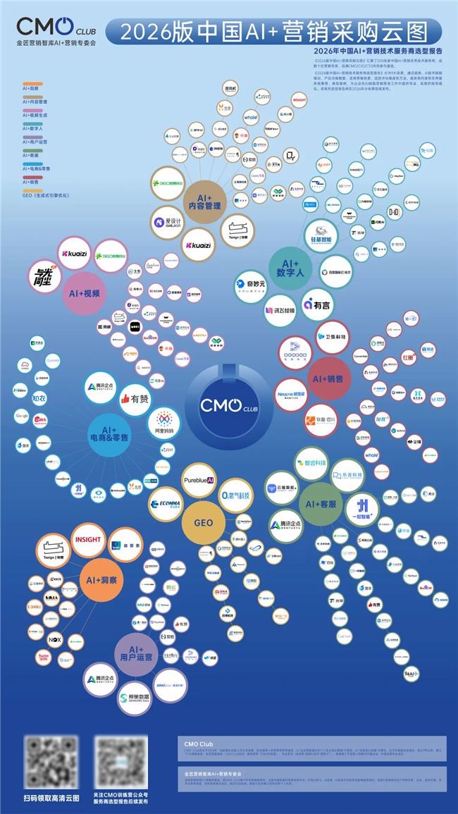 《中国AI+营销采购云图》由金匠营销智库专委会专家参与,涵盖AI营销9大场景,200+企业,全网征集,专业的征集、只遴选拿到实效、有企业使用的优质企业,赋能企业AI转型。不仅仅是一份AI产品、服务商名录,更是一份凝聚行业智慧的生态指南与选型攻略。