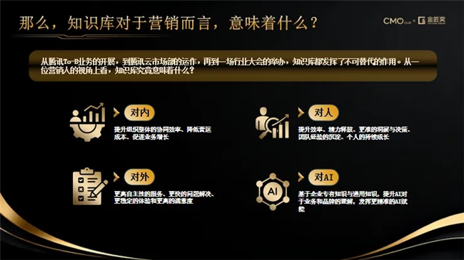 二、陈伟老师指出,知识库对企业的意义重大。面向企业内部,知识库能提升协同效率、降低营运成本、促进业务增长;面向企业外部,能提供更优质自主的服务,提升客户满意度。在帮助企业的个体释放精力、助力洞察决策、促进持续成长的同时,还可以成为AI的“专属知识课本”,提升AI对业务和品牌的理解,实现精准赋能。