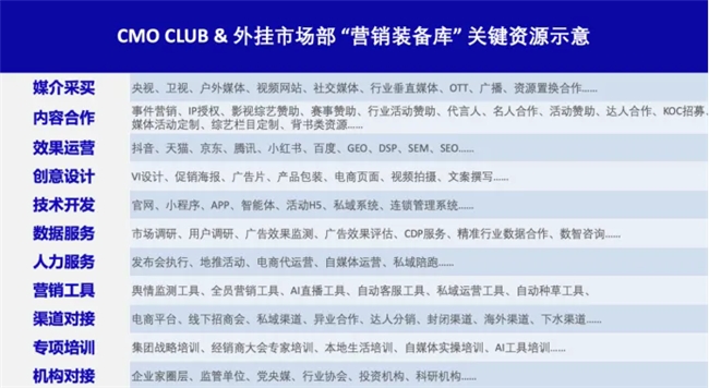 CMO Club联合外挂市场部发布,以全域资源整合与全链路服务,为企业解锁增长策略自由度,破解营销破局难题。共享落地装备库,以专业营销资源的整合能力,真正实现“围绕增长找办法”,装备库涵盖十二大核心服务板块,形成“资源无死角、组合无限制”的营销生态。