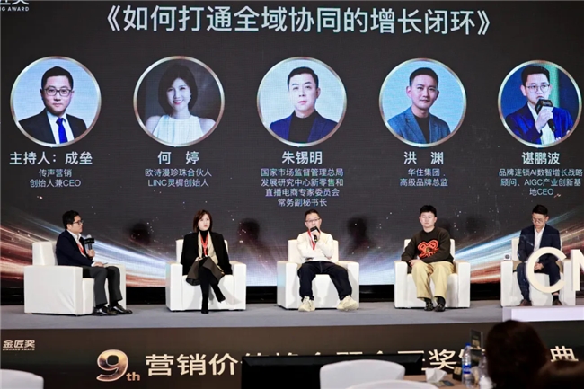 传声营销创始人兼CEO成垒、欧诗漫珍珠合伙人&LINC灵樨创始人何婷、国家市场监督管理总局发展研究中心新零售和直播电商专家委员会常务副秘书长朱锡明、华住集团高级品牌总监洪渊、品牌连锁Al数智増长战略顾问AIGC产业创新基地CEO谌鹏波围绕“全域≠全渠道堆砌:如何定义真正有效的全域运营架构?市场与销售的“全域对齐”:如何设计跨部门的KPI与激励机制?从自动化触达到个性化体验的跃迁:AI如何赋能全域运营提效?”三大议题展开讨论,探讨了“企业如何打通全域协同的增长闭环”议题。