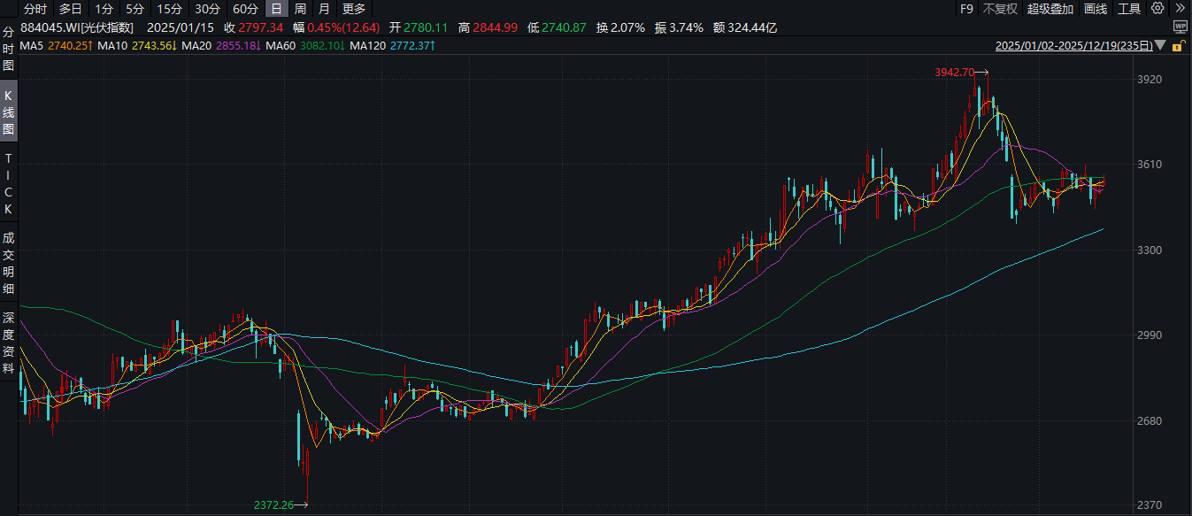 变化在股价上更为明显。截至12月19日,2025年光伏指数(884045.WI)收于3553.2点,全年上涨24.23%,相较年内低点反弹49.78%。和以往全线下跌不同的是,行业五强股价出现分化,隆基绿能(601012.SH)和阿特斯(688472.SH)年内股价分别上涨15%和21%,而晶澳科技(002459.SZ)、通威股份(600438.SH)和晶科能源(688223.SH)年内股价分别下跌19%、5.92%和14%。