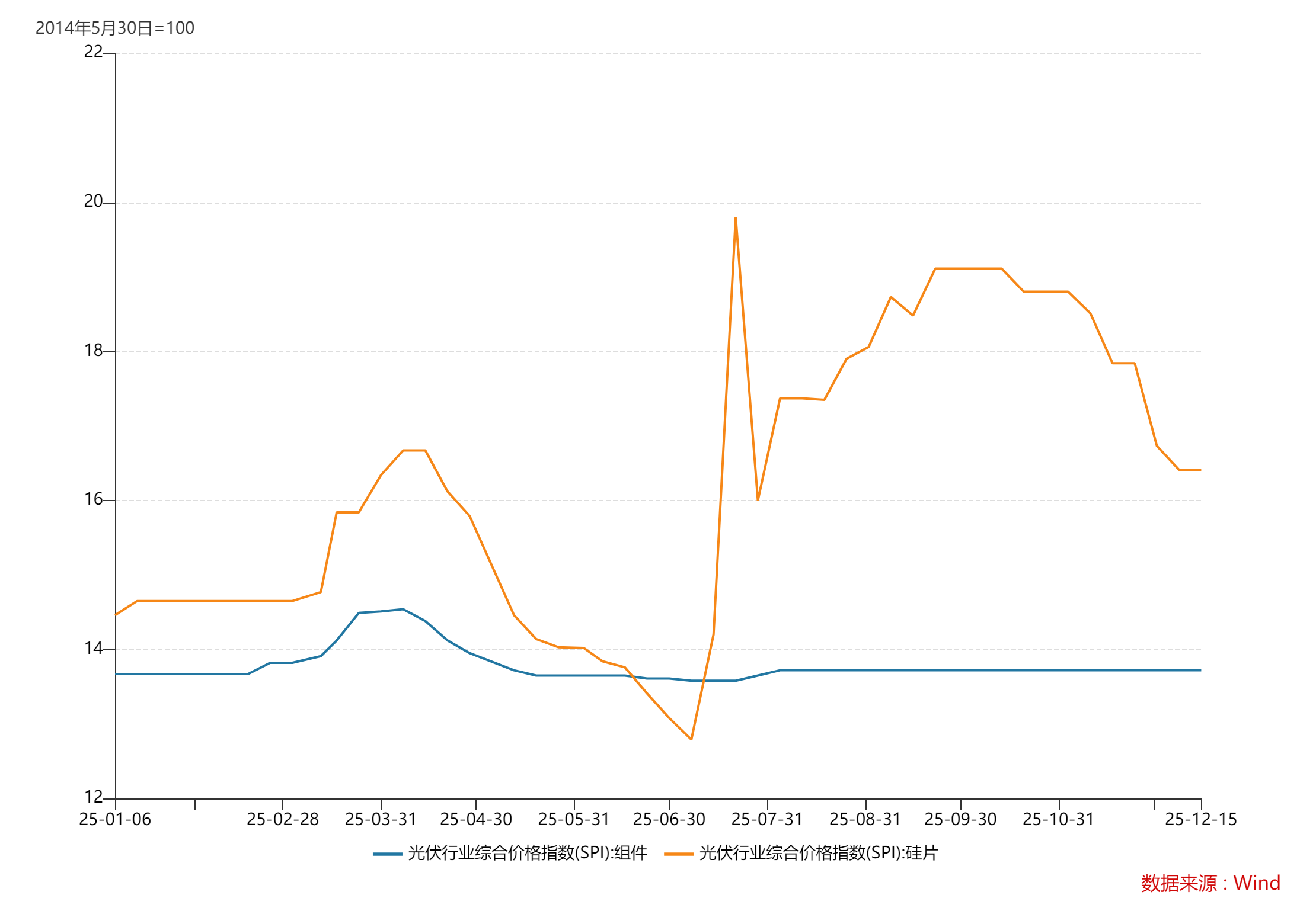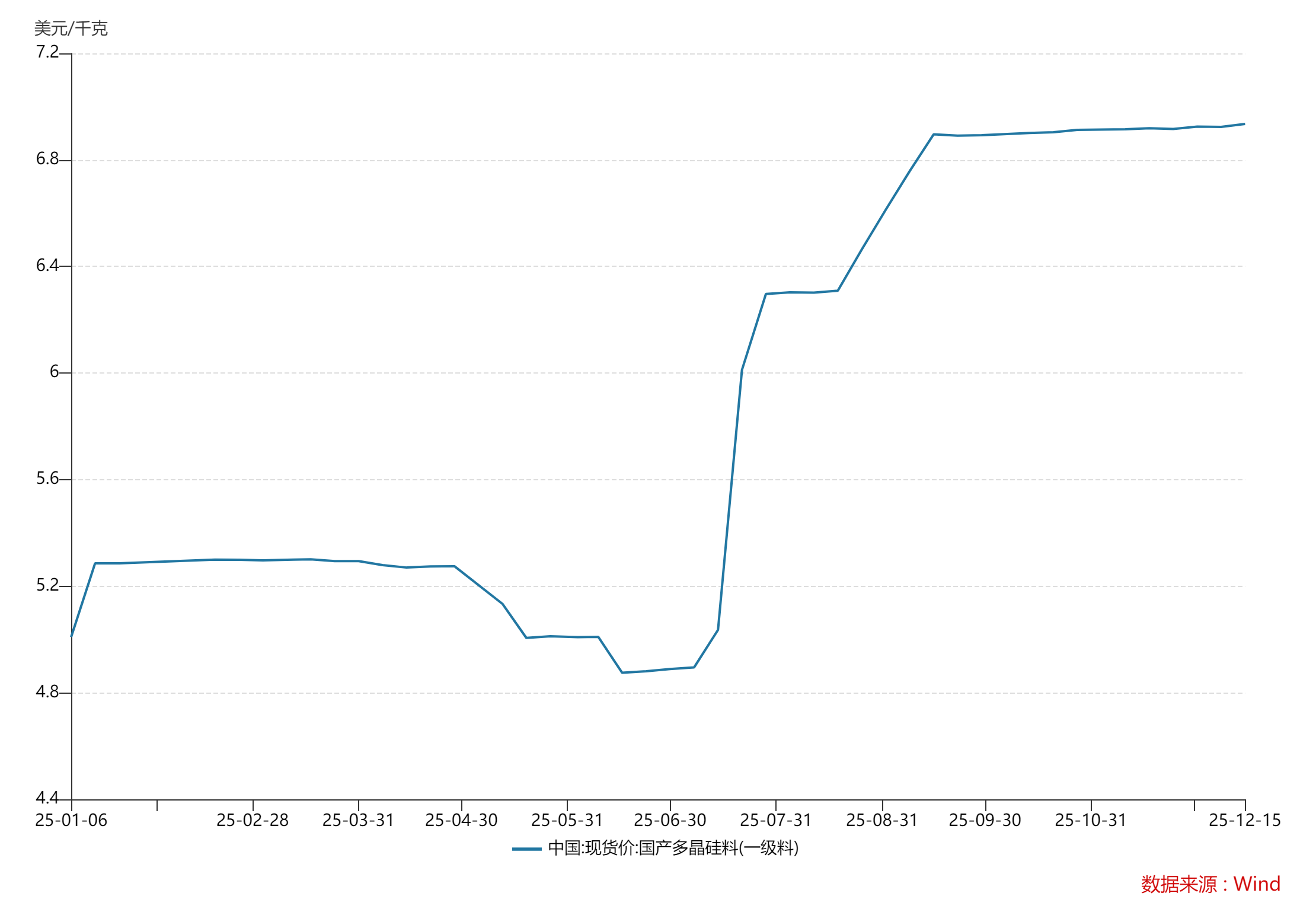 政策护航下,产业链上游价格持续回升。Wind数据显示,9月下半月以来国产多晶硅料(一级料)价格稳定在6.9美元/千克左右,较底部上涨超40%,市场测算该价格已可覆盖头部企业成本;截至12月15日,国产多晶硅料(一级料)价格为6.94美元/千克,创出年内新高。