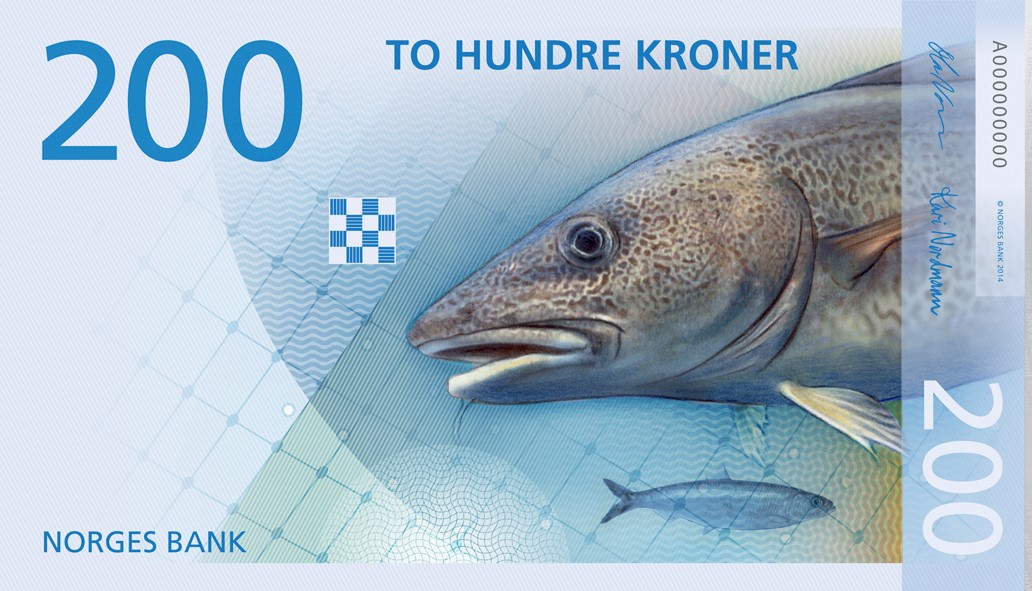 最近,挪威央行发布了新的200克朗纸币,上面印着一条鳕鱼。