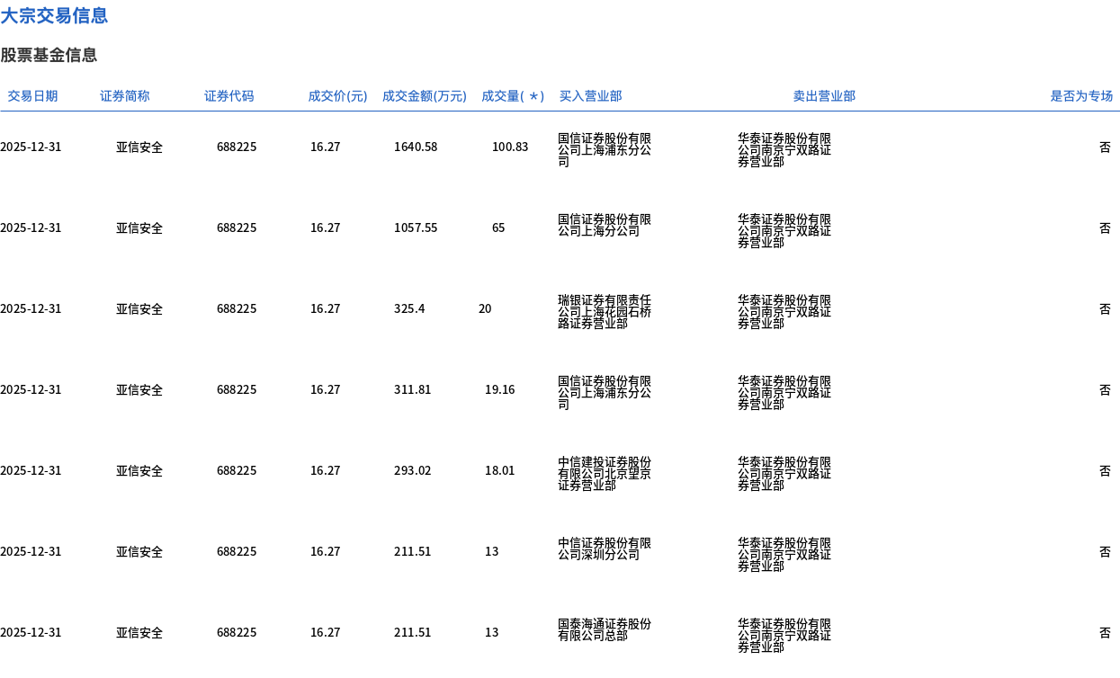 12月31日,亚信安全大宗交易成交249万股,成交额4051.38万元,占当日总成交额的21.48%,成交价16.27元,较市场收盘价19.4元折价16.13%。