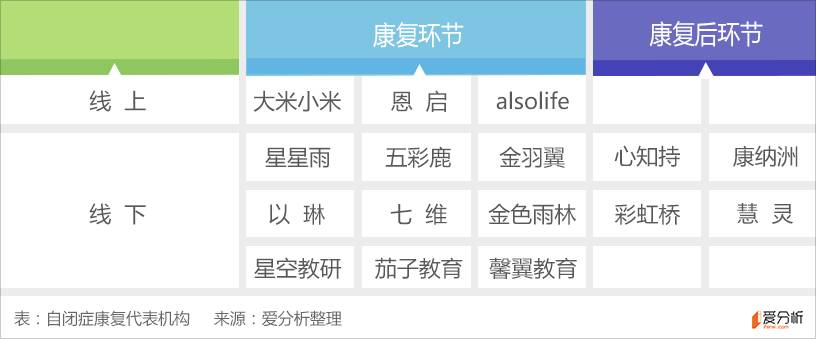 通过市场分析和爱分析调研,我们选取出了16家代表机构,并从服务形态和康复阶段两个维度进行了如下分类。
