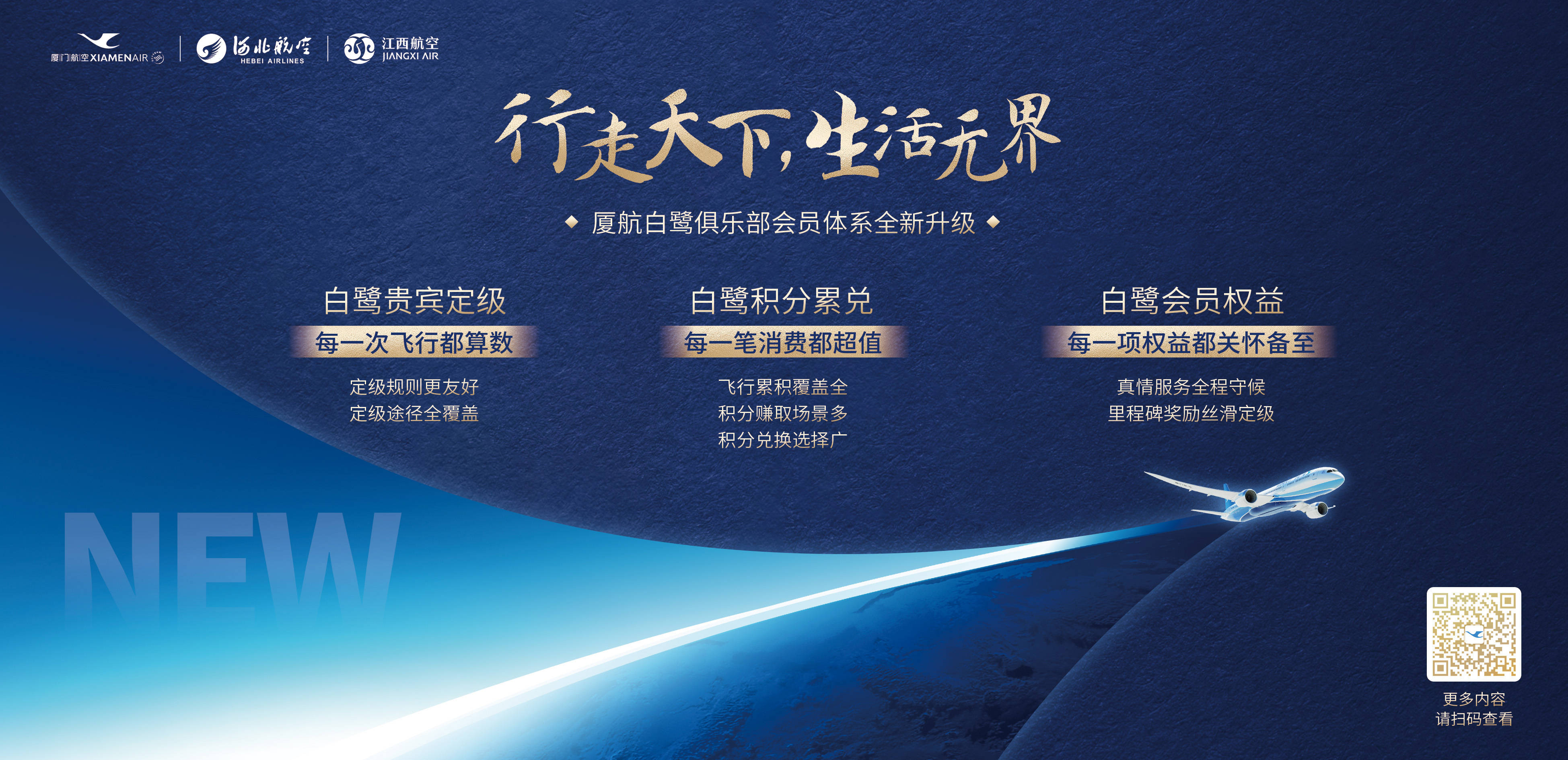 2026年1月1日,厦航发布全新白鹭俱乐部会员体系,以“行走天下,生活无界”为核心主题,全面升级常旅客计划。新体系充分吸纳了广大会员的宝贵意见,计划于2026年7月正式启用,将为超3000万白鹭会员带来定级规则简化、积分生态拓展、权益关怀升级等多重变革,是厦航深化“以诚为本,以客为尊”服务理念的重要举措。