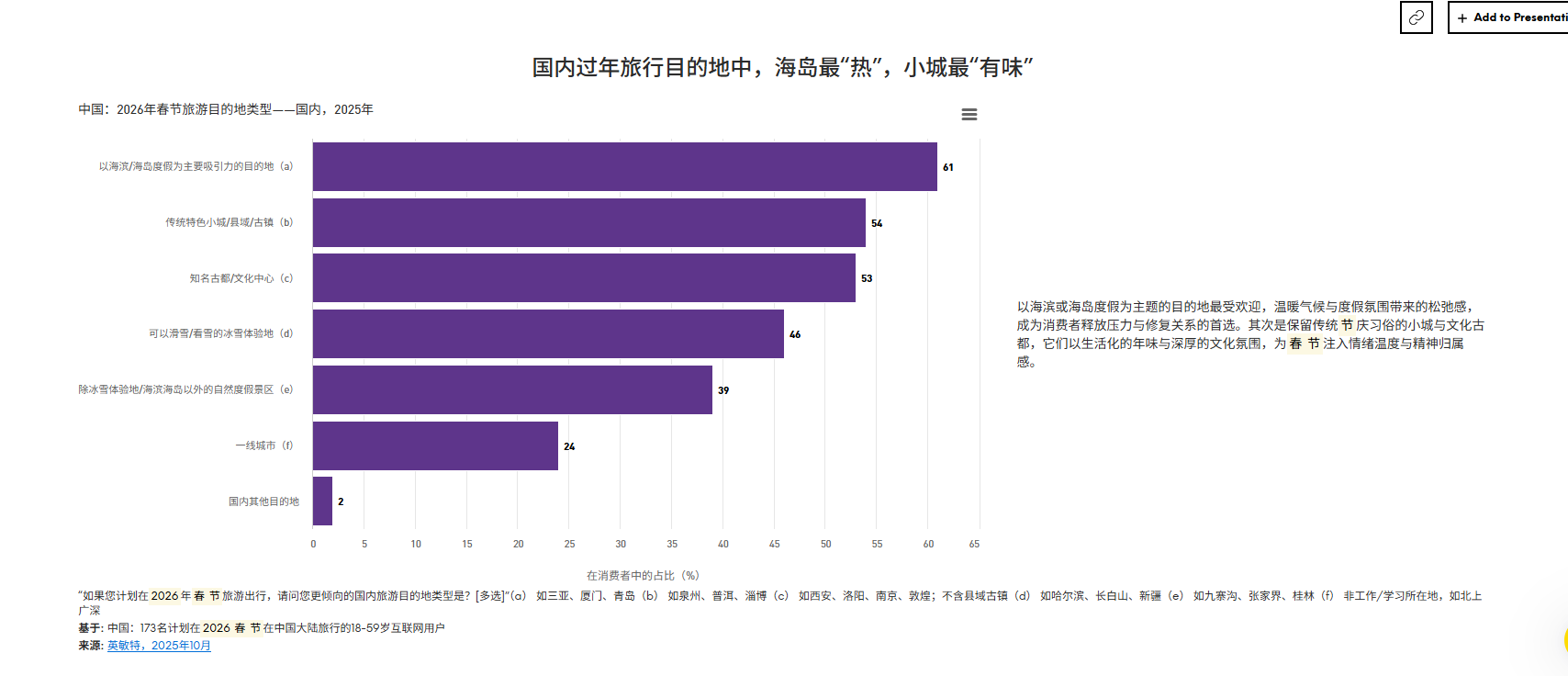旅行过年:离家不离节的氛围追求旅行过年人群比例较2021年显著上升,30-39岁中青年成为主力。国内目的地中,温暖海岛(如三亚、厦门)和年味浓郁的文化古都(如西安、泉州)最受欢迎;境外则偏好港澳、日韩及东南亚等具备中文氛围的目的地。酒店业已尝试沉浸式年味体验,如宝格丽酒店以生肖主题VR技术营造多感官氛围,亚龙湾希尔顿推出非遗手作活动,满足消费者“共聚一处,各自精彩”的需求。