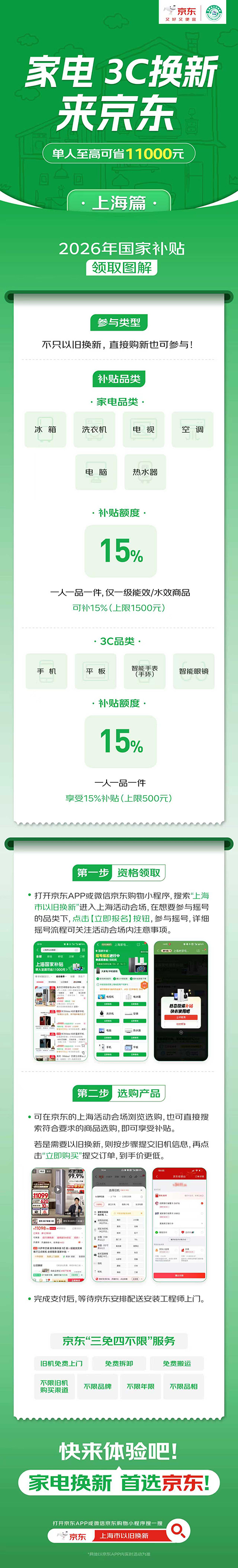 目前,上海市国补已上线京东,想换新家电及3C数码的上海消费者,即日起打开京东APP搜索“上海市以旧换新”,参与摇号领国补,选购心仪好物。