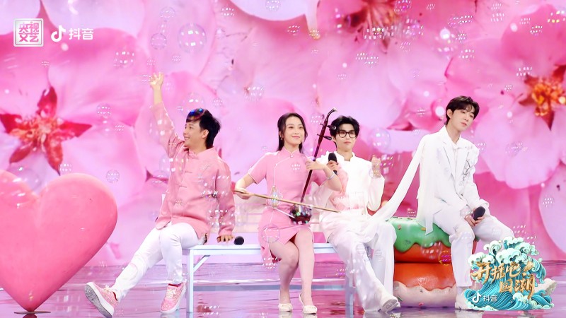 图|抖音主播@D.ONE男团 @爱琴二胡 和阿牛合作的节目《桃花朵朵开》