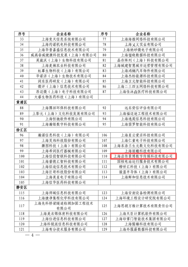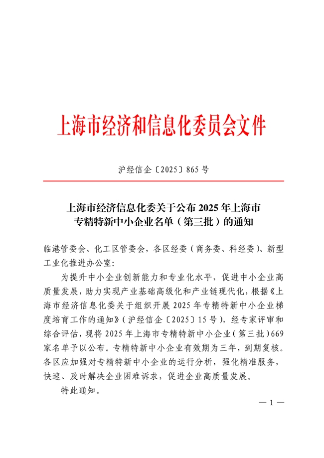 近日,上海市经济和信息化委员会发布《关于公布2025年上海市专精特新中小企业名单(第三批)的通知》(沪经信企〔2025〕865号),正式公布2025年上海市“专精特新”中小企业(第三批)名单。上海启传景博数字传媒科技有限公司凭借在专业化能力、技术创新及综合服务水平方面的持续积累,成功入选该名单。