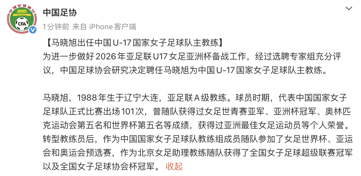 1月4日,据中国足协消息,为进一步做好2026年亚足联U17女足亚洲杯备战工作,经过选聘专家组充分评议,中国足球协会研究决定聘任马晓旭为中国U-17国家女子足球队主教练。