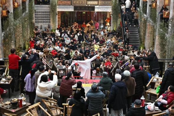 有人畅游在非遗博览园的灯海里,有人则选择在市中心的成都大旗茶馆感受烟火的日常。茶馆内人声鼎沸、热闹非凡,悠扬的川剧唱腔与清脆的盖碗茶碰击声交织,吸引了大批本地市民和外地游客前来打卡体验。