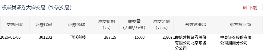 1月5日,飞沃科技大宗交易成交15万股,成交额2807.25万元,占当日总成交额的1.36%,成交价187.15元,较市场收盘价190元折价1.5%。
