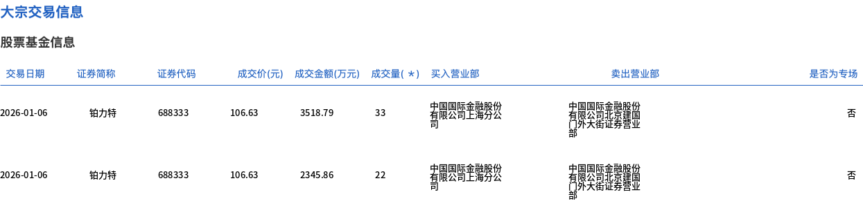 1月6日,铂力特大宗交易成交55万股,成交额5864.65万元,占当日总成交额的2.09%,成交价106.63元,较市场收盘价106.63元持平。