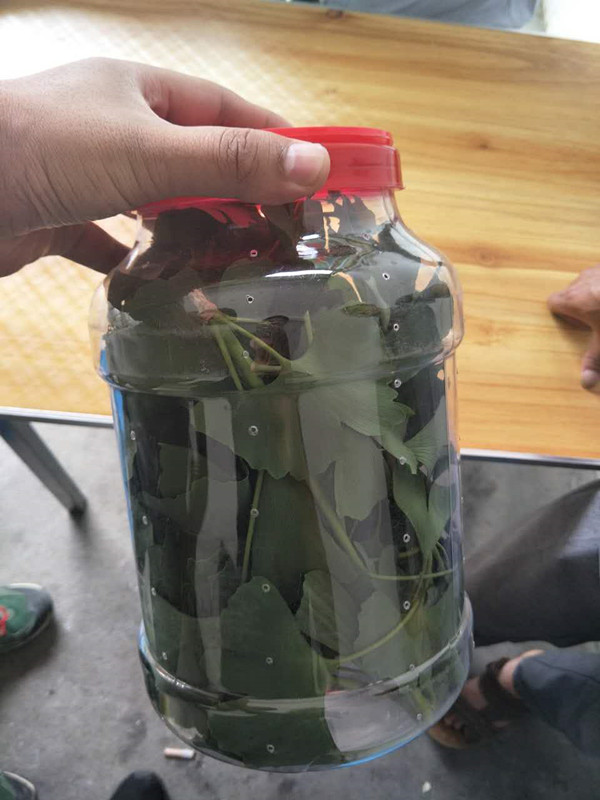 在这家收购点房间桌子下仍存放着五只装满银杏叶打满孔的塑料瓶子。每个瓶子直径约15厘米,高约25厘米。这位婆婆说:“这些瓶子都是备着的”。