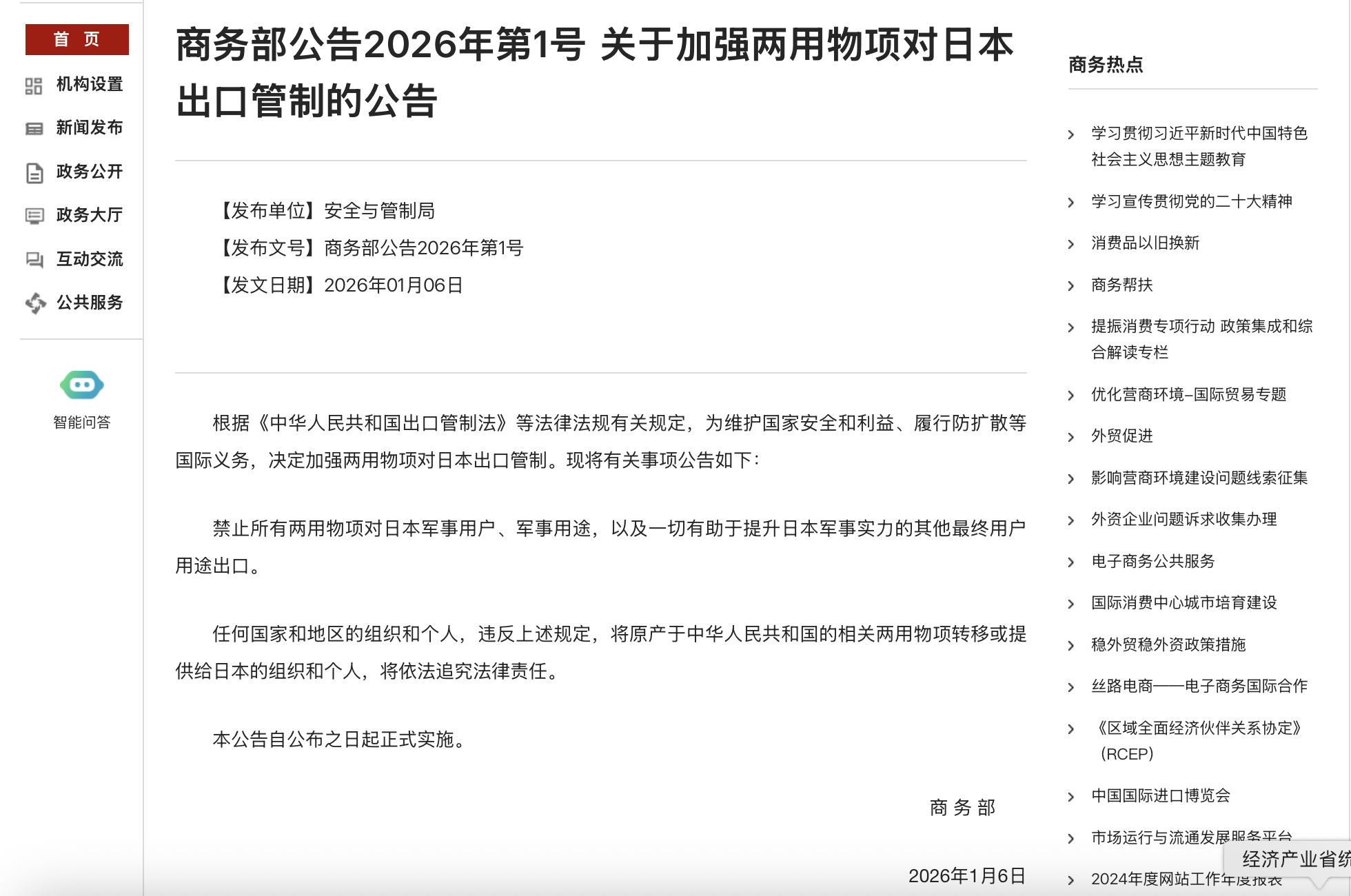 1月6日,商务部发布公告称,根据《中华人民共和国出口管制法》等法律法规有关规定,为维护国家安全和利益、履行防扩散等国际义务,决定加强两用物项对日本出口管制。