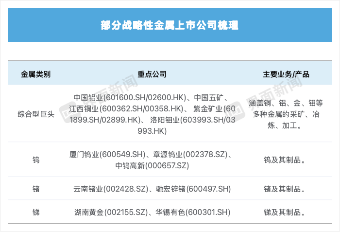 据界面新闻梳理,国内上述有色金属相关企业包括云南锗业(002428.SZ)、驰宏锌锗(600497.SH)、中国铝业(601600.SH)、厦门钨业(600549.SH)等等。