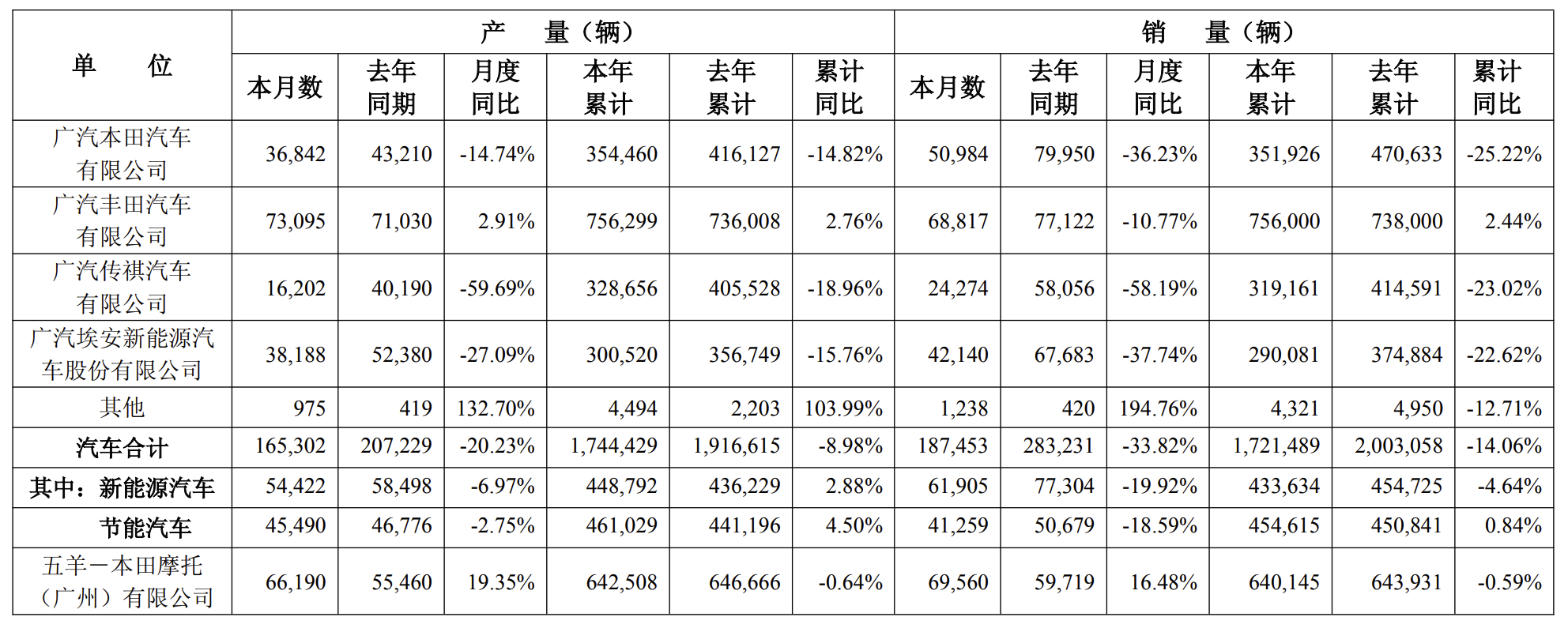 广汽集团1月7日晚间公告,公司2025年12月汽车产量为165,302辆,同比下降20.23%,本年累计产量为1,744,429辆,同比下降8.98%;12月汽车销量为187,453辆,同比下降33.82%,本年累计销量为1,721,489辆,同比下降14.06%。