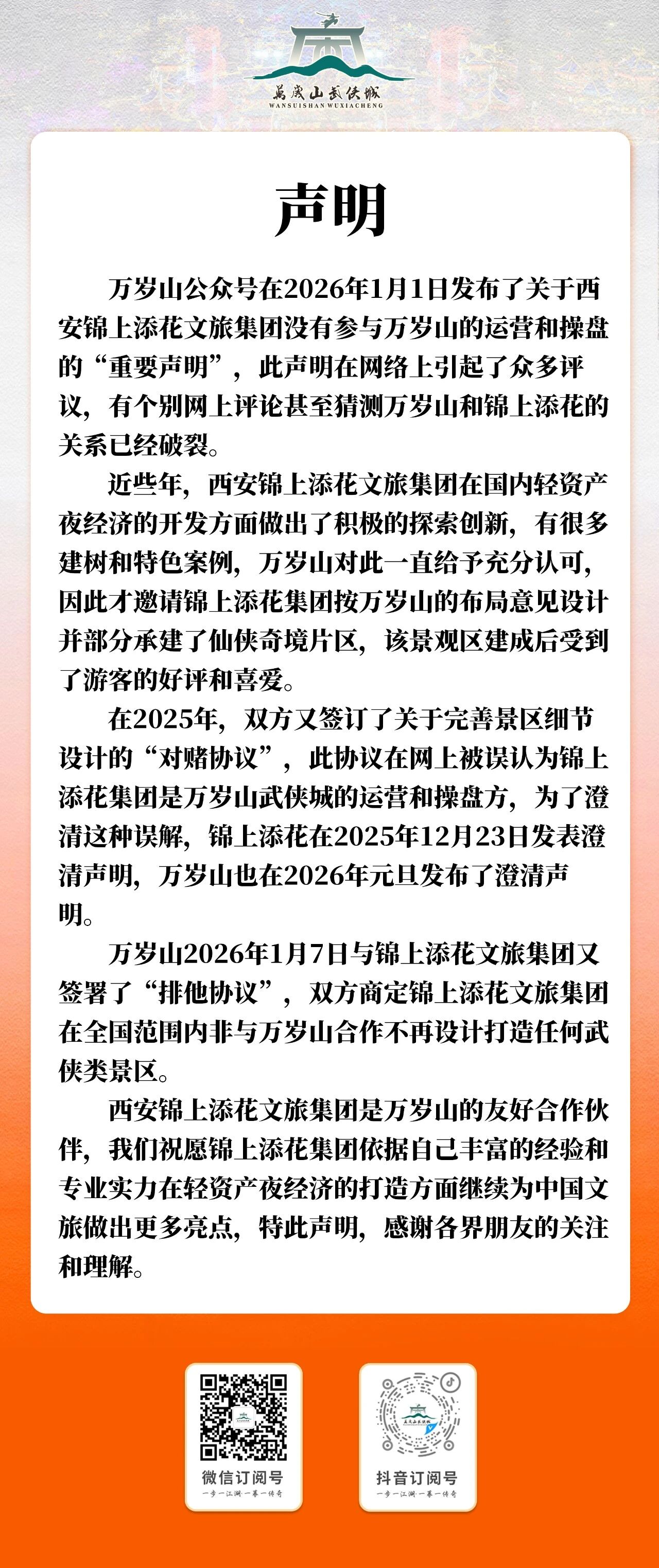 1月8日上午,万岁山武侠城发布万岁山与锦上添花文旅集团合作情况声明。声明称,万岁山2026年1月7日与锦上添花文旅集团又签署了“排他协议”,双方商定锦上添花文旅集团在全国范围内非与万岁山合作不再设计打造任何武侠类景区。