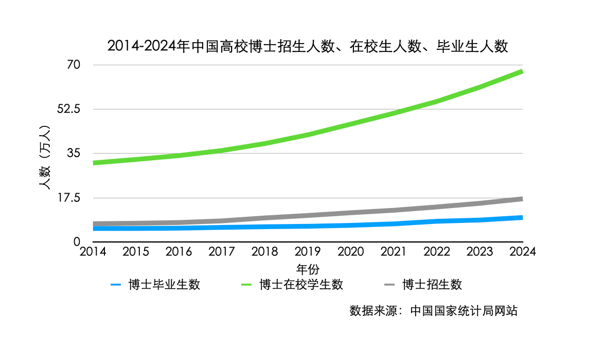 而在中国和印度等国家,《文章》提到,博士生数量则是“爆炸式增长”。界面新闻查阅发现,据中国国家统计局数据,2014至2024年期间,我国博士的招生人数从约7.26万人增长至约17.11万人,涨幅约为135.67%。而博士在校学生人数从2014年的约31.27万人,增至2024年的67.63万人,涨幅约为116.28%。此外,博士毕业生人数从2014年的约5.37万人,增长至2024年的约9.72万人,涨幅约为81%。