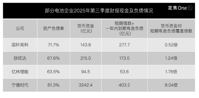 结合货币资金与短期有息负债的对比,更能看出差距:宁德时代手握的现金是有息负债的8倍以上;欣旺达账上215亿现金中,短期要还的债就有173亿;国轩高科的现金甚至已覆盖不了短期债务。