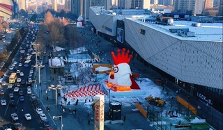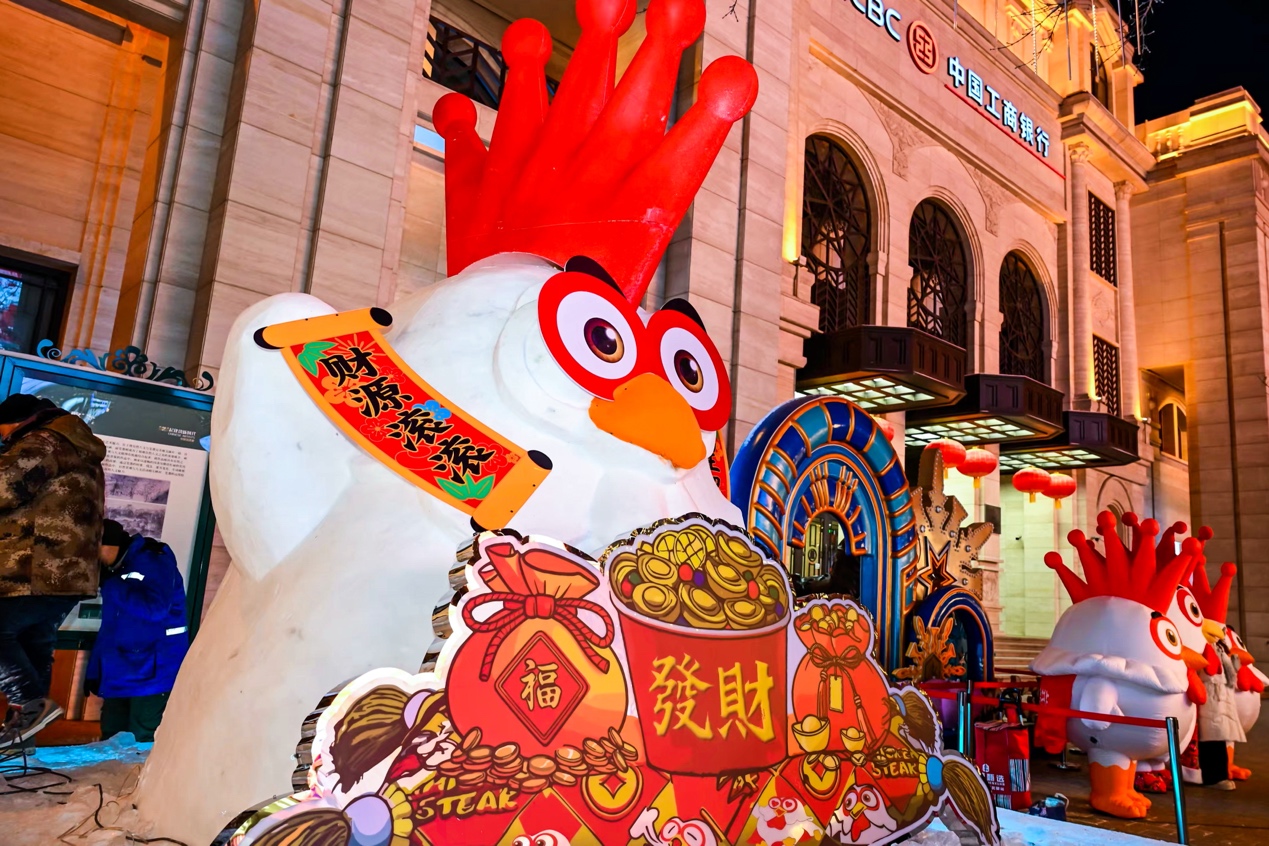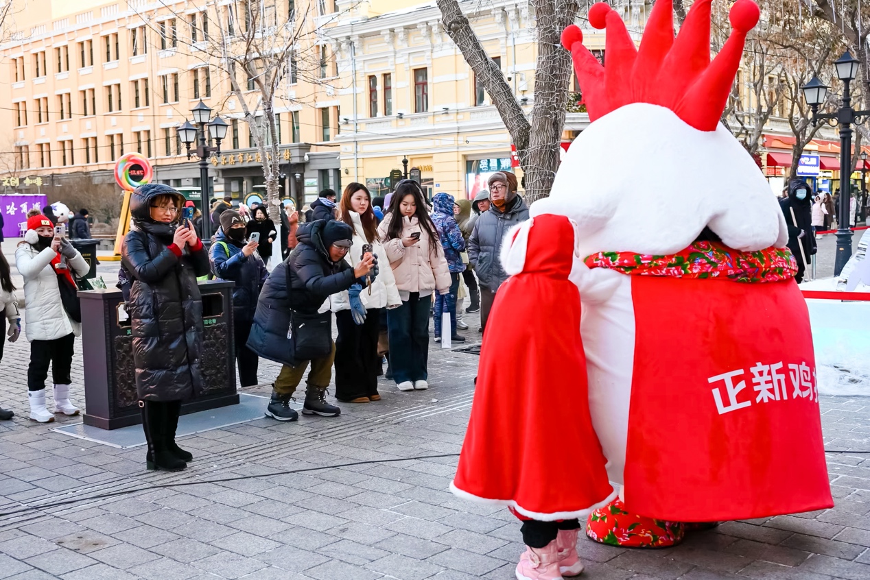 而在中央大街,中国工商银行旁的“发财鸡王”雪雕则更注重情绪共鸣。雕塑头顶红冠,手持“财源滚滚”对联,怀抱聚宝盆,寓意新年好运。正新鸡排的玩偶巡街,与游客互动合影,将情绪价值拉满,它还给游客派发了福利彩票,让运气延续一整年。这种设计满足了人们在冬日寻求温暖和讨个好彩头的心理,让品牌形象自然融入年轻人社交分享的场景,给“鸡王”增强了传播力。