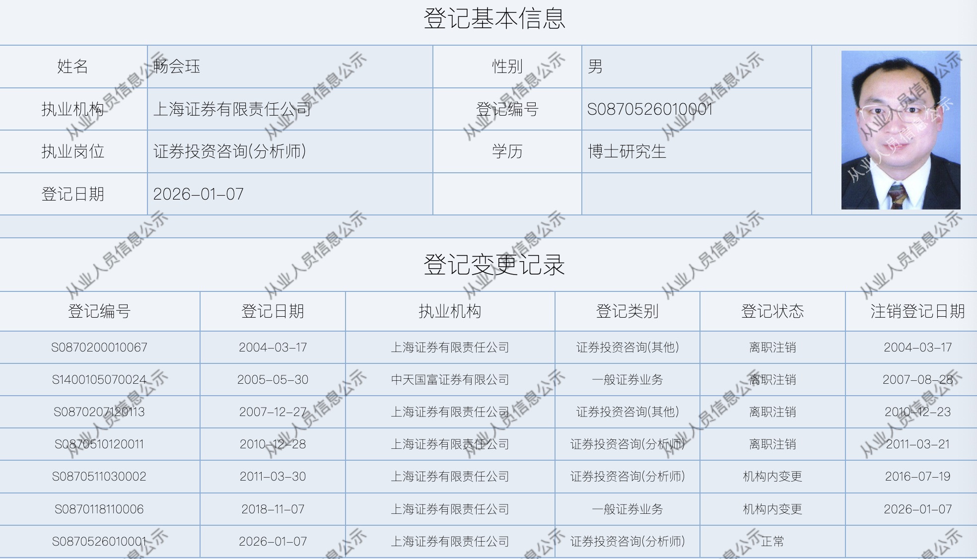 中证协网站显示,1月7日,上海证券研究老将畅会珏的执业登记信息由“一般证券业务”变更为“证券投资咨询(分析师)”。