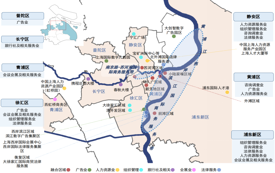 在空间聚集上,《行动计划》规划了清晰的“产业地图”:打造黄浦江两岸滨江国际商务服务集聚带,提升发展“南京路—苏河湾”国际商务服务集聚带,与此同时,做优做强特色鲜明、配套完善的专业型集聚载体。