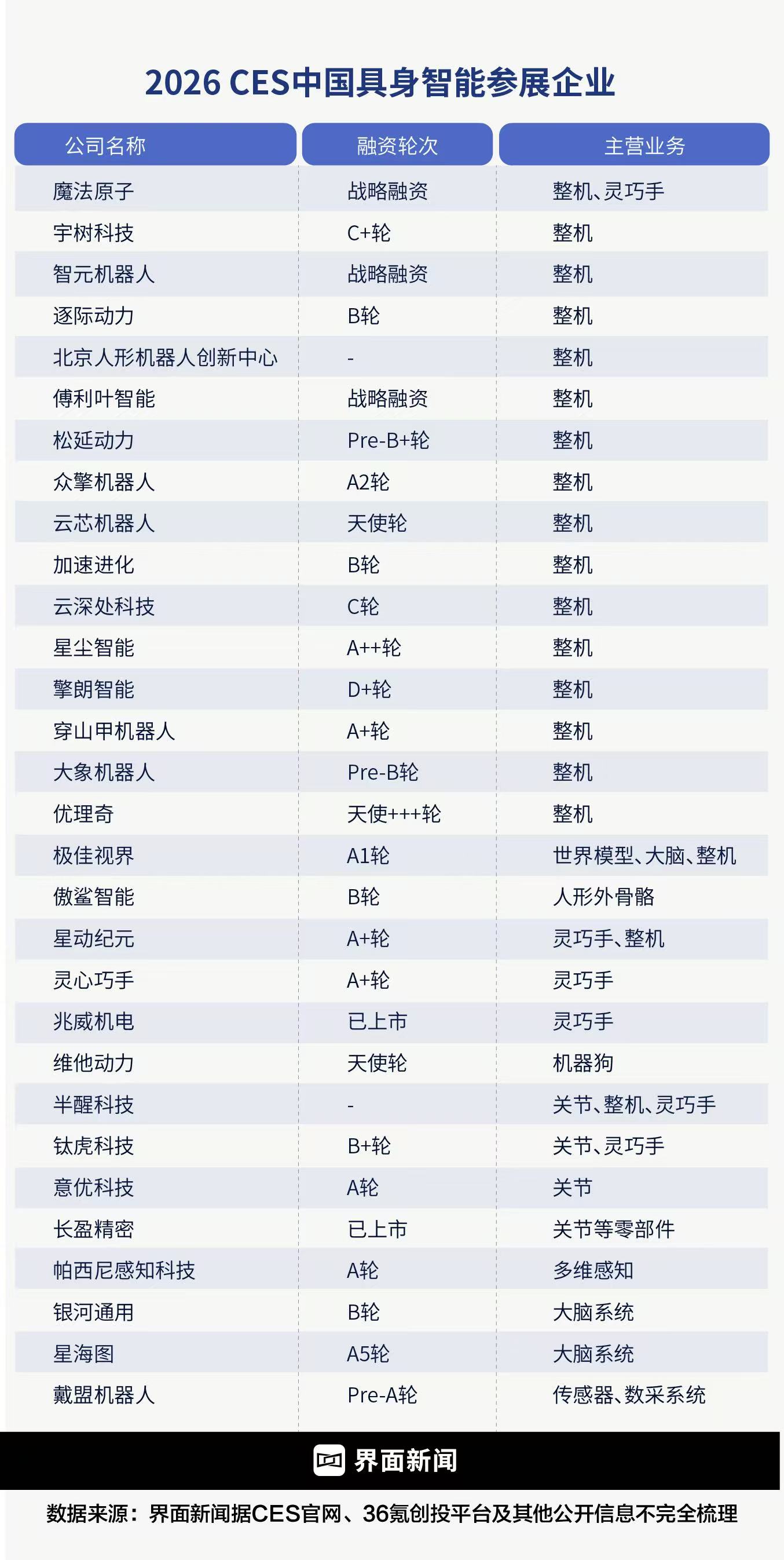 每年固定在美国拉斯维加斯举行的CES(国际消费类电子产品展览会),正在成为中具身智能厂商出海战略的必经关口——他们从2025年近10家拥有独立展台的中国机器人小队,到2026年已经扩充为一个近30家企业组成的中国机器人军团。