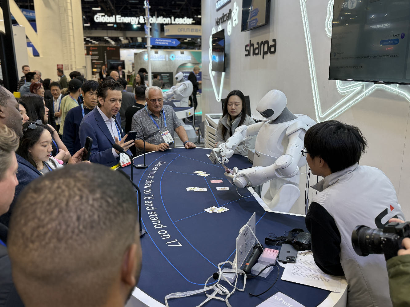 来自新加坡的机器人企业Sharpa Robotics有不同的做法。在拉斯维加斯这座世界上最大的赌城,他们将演示场景放到了一张牌桌上,可以邀请三位人类玩家,由机器人负责发牌和推进游戏,最后依靠视觉判断谁为赢家——这可能是整个展区人气最旺的一个点位。