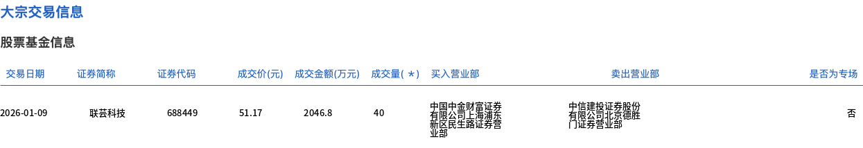 1月9日,联芸科技大宗交易成交40万股,成交额2046.8万元,占当日总成交额的3.77%,成交价51.17元,较市场收盘价51.95元折价1.5%。