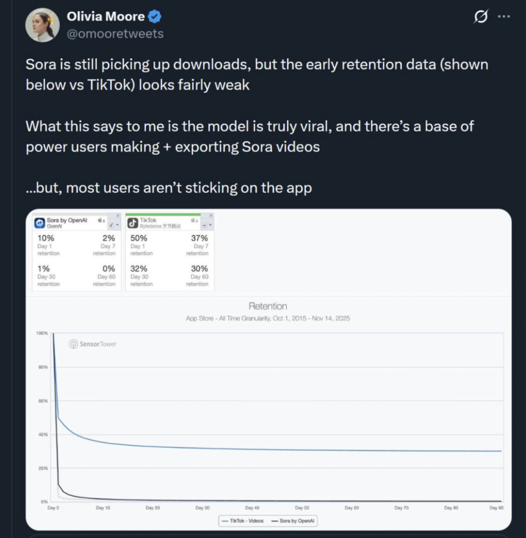 从上线初期SoraApp的火爆程度来看,AI分身、AI客串、AI混剪等玩法,吸引了很多早已跃跃欲试的尝鲜用户,上线四天即登顶美国区AppStore免费应用榜。然而,12月初a16z合伙人Olivia Moore分享的一组数据,却给OpenAI泼了一盆冷水。数据显示,上线以来Sora App的用户留存率直线下滑,90%的用户一天即走,98%的用户没有坚持过一周,两个月后,第一批涌入的用户已经悉数离开。