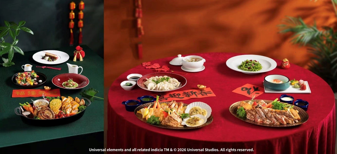 在环球影城大酒店,来自照明娱乐的小黄人与格鲁一家将身着新春盛装亮相莲花园餐厅,为游客带来电影角色互动问候。诺金度假酒店禾家中餐厅则精心推出多款团圆宴套餐,以精致中式美馔陪伴游客共同庆祝马年新春。此外,北京环球城市大道多家餐厅亦同步上新节庆美食,以各具创意的年“味”表达。